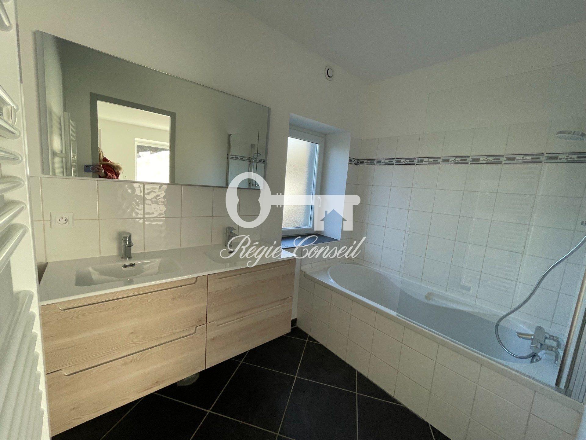 Nous vous proposons cette maison au calme, entièrement rénovée, de 74.14m², comprenant au RDC une cuisine aménagée et équipée (four, plaques de cuisson, hotte et lave-vaisselle) ouverte sur le séjour, une salle de bains avec meuble double vasques, un WC, et un cellier.